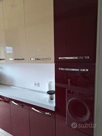 Cucina tenuta in ottime condizioni e molto spaziosa, lucida, laccata, con basi color bordeaux, pensili color avana e top bianco. Circa 2,60 m di lunghezza e profondità di 60 e 34 cm (lato sinistro e destro, rispettivamente). Fornita di frigorifero, freezer e forno Indesit, quattro fornelli a gas, lavello in acciaio inox e spazio per la lavastoviglie/lavatrice situato accanto al lavello. Comprensiva di tre cassetti scorrevoli, dieci pensili e sei basi. La cucina è dotata anche di un forno grill/microonde Samsung (se di interesse). Disponibile da subito!