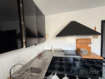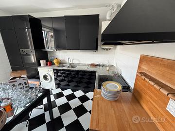 Regalo Cucina marca Disegno.Due (Schiffini), con top in marmo. Misure: lato lungo 400 cm Lato corto 225 cm Con mobile basso lunghezza 251 cm Altezza 71 cm Profondità 47 Mensola lunghezza 200 cm Larghezza 15 cm