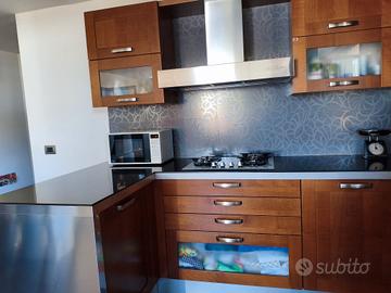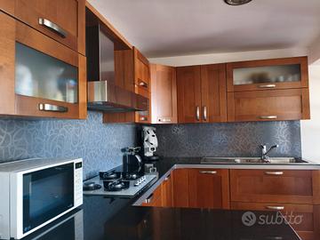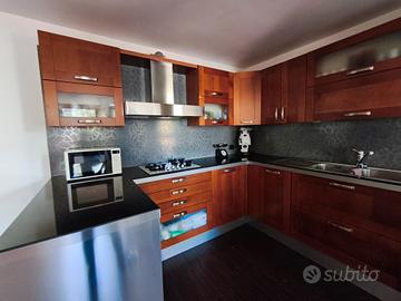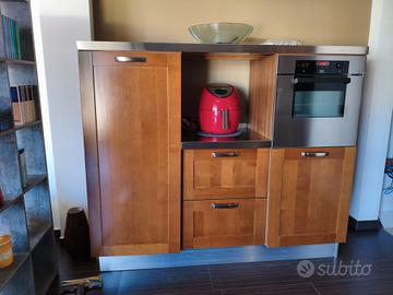 cucina in ciliegio e acciaio. GRUPPO COLONNE: altezza: 1.54m Lunghezza: 1.79m top superiore e top vano a giorno centrale in acciaio inox completa di frigo (senza congelatore). COMPOSIZIONE AD ANGOLO: Lunghezza: 2.76m completa di cappa in acciaio inox (marca Falmec) Larghezza: 2.10m completa di lavello in acciaio inox due vasche più gocciolatoio . DIFETTI: -top cucina lesionato all'altezza del piano cottura (poco visibile). RITIRO E TRASPORTO A CARICO E CURA DELL'ACQUIRENTE. PENISOLA: Lunghezza: 1.35m profondità top: 60cm. con top in granito (nero d'Africa).