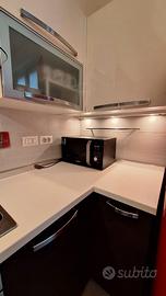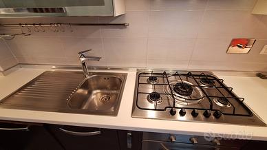 Causa trasloco, vendo cucina Veneta Cucine, attualmente posata angolare ma rimodulabile. La parte superiore è laccata bianca, quella inferiore è in essenza legno grigio scuro. Misura 3,60mt nella parte centrale, profondità 60cm, altezza 2,10mt. La parte sinistra, con quattro cassetti, misura cm90x60, la parte destra è cm35x60 ed ha un'anta. E' completa di forno e lavastoviglie Electrolux, piano gas a 5 fuochi e cappa aspirante. Il lavabo è in acciaio Franke. Non ha il frigo da incasso, se interessa è disponibile un frigo Smeg rosso con congelatore superiore, cm168x60x67 di profondità. La cucina è ben tenuta, senza danni, macchie o graffi. Smontaggio e trasporto sono a carico dell'acquirente. Il prezzo è trattabile. Possibilità di acquistare gli elettrodomestici singolarmente.