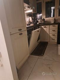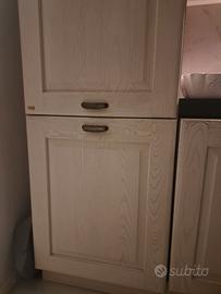 Cucina effetto rovere bianco con maniglie argento invecchiato composta da frigorifero/congelatore incassato, lavastoviglie, forno smeg con resistenza da cambiare, sottolavello, cassettiera, pensile angolare, pensile + cappa, pensile con sportello grigliato., fuochi ad induzione,