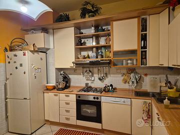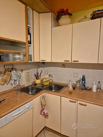 Vendo cucina Meson’s così composta: basi di profondità 60 cm, di lunghezza 75 cm (con un ripiano all’interno), 45 cm (on ripiano), 2 da 30 cm (con ripiano), 70 cm (solo ante adatta per lavastoglie o lavatrice), 15 cm (estraibile, porta bottiglie), cassettiera da 45 cm (4 cassetti di cui uno con porta posate). Lavandino ad angolo in acciaio inox con doppia vasca e sgocciolatoio: la base ha due ante da 38 e 35 cm. Tre pensili di altezza 70cm, profondità 30 cm, lunghezza: 1 da 45 cm e 2 da 85 cm con un ripiano all’interno. Un angolo 30x60 cm con scolapiatti, altezza 102 cm. Altri 2 pensili profondi 33 cm, alti 102 cm, lunghi 60 cm. Vano a giorno con 2 ripiani lungo 15 cm. Pensile (in foto sopra il frigo) 36x25x60cm. Cappa a vista Elica 90 cm con 3 mensole. 4 sedie di legno impagliate. Zoccoli, top, alzatine.No elettrodomestici. In buono stato, tranne il top e le ante sotto il lavandino