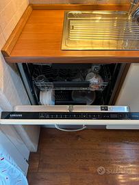 Struttura, piano, mensole in laccato ciliegio. Interno ciliegio. Frontali color avorio. Pannello a copertura con tre faretti luce. Elettrodomestici inclusi e funzionanti: forno Rex modello FMS41X, anno 2002, V.55L ; lavastoviglie 12 coperti Samsung modello DW60A8050BB, classe energetica C, anno acquisto 2023 ; piano cottura in acciaio, 5 fuochi a gas, marca SMEG ; microonde Samsung Smart Over.