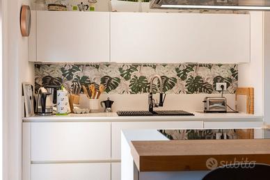 Cucina con isola in vendita, realizzata su misura da artigiano paritetica a marca Dada. Colore bianco opaco, ante con spessore di 2Cm, pensili con apertura vasistas, facciata+fianchi a vista da 2,2Cm e zoccolo da 8Cm.