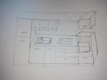 Vendo cucina con elettrodomestici perfettamente funzionanti ( forno e lavastoviglie). Non è presente frigorifero. Allego schema perché già smontata ed imballato. Dimensioni piano cm 210 x 92. Forno largo 60 per altezza 103. Mobile frigo largo 60 ed altezza 230.Richiesta euro 300