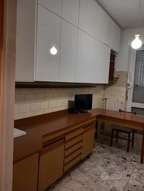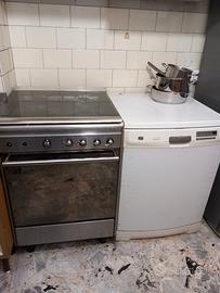 Regalo cucina in legno, parte inferiore marrone, parte superiore bianco, tavolo, cucina a gas, lavastoviglie.