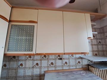 Pensili con vetrinetta 180x33x105 + elem portabarattoli 69x15x33; Colonna frigo 234 (esclusi piedini) x59.5x58.5 + elem portabarattoli 15x58.5x75;