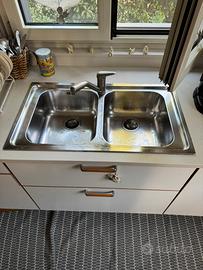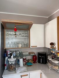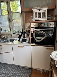 La piattaforma permette il caricamento di sole 6 foto. Per ulteriori dettagli, contattatemi pure in privato. Vendo cucina con disposizione ad angolo in ottime condizioni, dal design moderno ed elegante con ante bianche e finiture in legno naturale. Una soluzione spaziosa e pronta all'uso, ideale per arredare con stile ampi spazi. Dimensioni: Lato corto 150cm x Lato lungo 420 cm x profondità 60 cm Elettrodomestici e componenti inclusi: • Piano Cottura SMEG: 5 fuochi in acciaio inox con griglie di design. • Frigorifero SAMSUNG: Modello combinato (frigo + freezer) a libera installazione, finitura Platinum Inox con display digitale. • Forno CANDY: Integrato nella colonna, multifunzione, finitura acciaio inox. • Cappa FABER: Modello d’arredo cilindrico in acciaio inox. • Lavello: Doppia vasca in acciaio inox completa di miscelatore. • Struttura: Basi, cassettoni, pensili e colonna forno. Nota: Sono esclusi dalla vendita i piccoli elettrodomestici da appoggio, gli accessori e l'oggettistica visibile nelle foto. ARTICOLO NON DISPONIBILE FRAZIONATO SMONTAGGIO E TRASPORTO A CARICO DELL’ACQUIRENTE