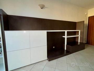 •Mobile sala per tv e libreria componibile con sportelli laccati.