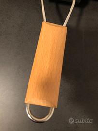 Bistecchiera in alluminio (materiale che diffonde il calore in modo uniforme). Manico piegabile. Dotata di beccucci per versare il liquido. Rivestimento in Teflon antiaderente. Con fondo rigato. Colore: nero. Manici in legno (colore: beige chiaro). Usata ma ancora in ottime condizioni. Interno senza imperfezioni. Manico perfettamente funzionante.