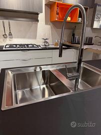 Svendita per rinnovo esposizione! Cucina Stosa Mod. Replay, polimerico finitura pino basalto e bianco cloud opaco, vani a giorno olmo mercurio e arancio opaco. Top Fenix sp. 2 cm + bancone Olmo mercurio sp. 6 cm, guide e cerniere ammortizzate completa di organizzatore per cestoni, pattumiera per differenziata, portaposate da 120 cm inox, barra portaoggetti wing 90 cm con led e cappa Magic da 90 cm con pensile motorizzato. Completa di elettrodomestici: Forno FRANKE Crystal (10 funzioni di cottura, display LCD e comandi touch, menù completo, pizzaplus e cottura wellness), Piano cottura FRANKE da 75 cm 5 fuochi con griglie in ghisa, Lavastoviglie da 60 cm SIEMENS A+++ 3 cestelli, Lavello acciaio Neptune Plus FRANKE 2 vasche, Miscelatore FRANKE Lounge Doccia, Frigo (Non incluso). Misure: Lato muro 400 cm, lato lavello 210 cm, lato bancone 220 cm, H. 219 cm Prezzo listino inclusi elettrodomestici sopra elencati euro 14161, prezzo promo euro 7000 (escluso montaggio). Possibilità di poter modificare la composizione con una lineare.