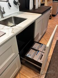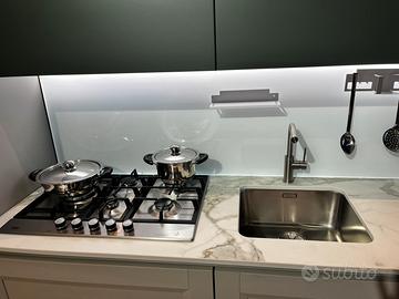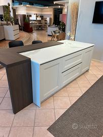 Sma emporio casa vende per rinnovo locali cucina modello Asia, lineare+isola : -L. 3.93 P. 64 H. 216 (parte lineare) -L. 250P. 104 (isola con piano snak) - Top sp. 2 cm in gres porcellanato colore calacatta -Elettrodomestici Beko di cui : p.c. 5 fuochi inox, forno multifunzione nero , lavastoviglie L.60 , frigorifero L.60 -schienale in vetro con luce incorporata -boiserie in legno con mensole come piano snak -cantinetta vini pando CUCINA VISIONABILE IN SEDE A CALVATONE PER INFO CHIAMARE 037597677