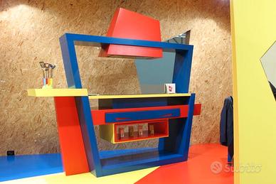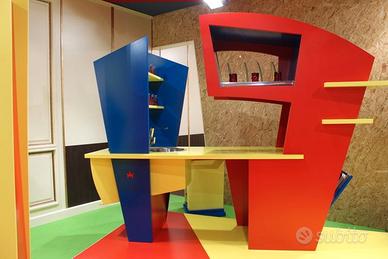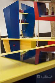 Concetto di cucina slegata dalle pareti , realizzata in listellare e laccata con colori primari.