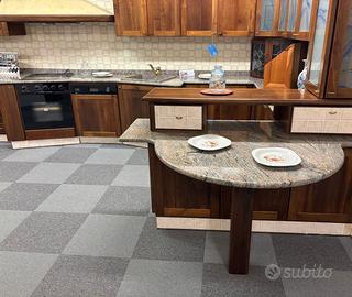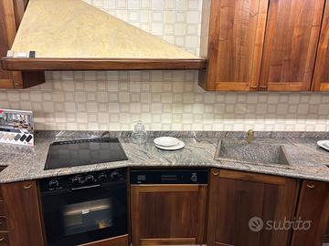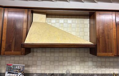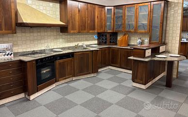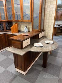 Cucina in arte povera in massello di noce nazionale, particolare la forma, della zona cottura e lavaggio a forma di ali ,come particolare è il bancone della penisola.