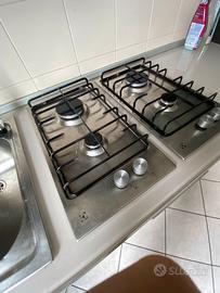 Doppio lavabo in acciaio, doppio piano cottura, cappa, pensile, piano di lavoro, piattata e dispensa.