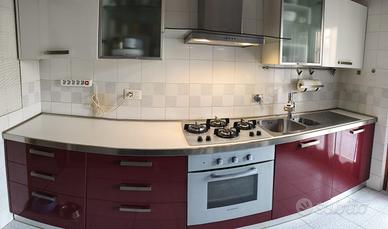 La cucina presenta basi e pensili con finitura lucida color bordeaux, piano di lavoro chiaro e dettagli in acciaio che donano un tocco contemporaneo. È composta da: