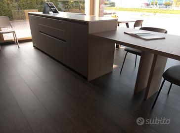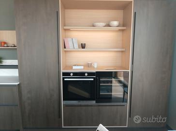 Cucina moderna Zecchinon con isola , nuova da esposizione. Cucina con gola strutturale e profilo maniglia su anta , con materiali di pregio come le ante in vetro opaco su telaio alluminio dell'isola o il laccato opaco finitura plissè dei pensili, a completare in finitura materico metallico ed effetto legno basi e colonne e tavolo incorporato. Cucina completa di elettrodomestici, piano in quarzo venato opaco anche su alzata .
