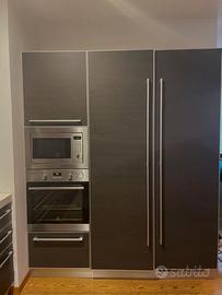 Cucina composta da una parte lineare di lunghezza mt 3,36 e profondità 60 cm comprendente: base lavastoviglie, base lavello con raccolta differenziata, due basi a cestoni, lavello in acciaio inox con due vasche e gocciolatoio, piano cottura in acciaio inox con 5 fuochi di lunghezza 70 cm. Una seconda parte formata da 3 colonne di cui: una forno e microonde, una dispensa e una frigo.