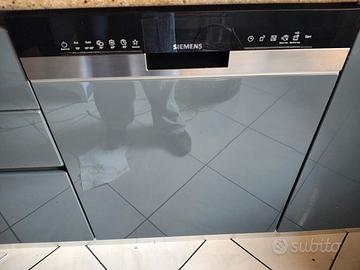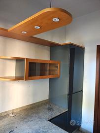 Cucina tre lati in stile moderno, ante laccate in grigio, inserti color legno, vetro satinato. Piano e tavolo in marmo, faretti led, elettrodomestici perfettamente funzionanti: forno e microonde, lavastoviglie, frigorifero. Disponibile ad Albavilla. Prezzo originale 38.000 euro. Smontaggio e trasporto a carico dell'acquirente.