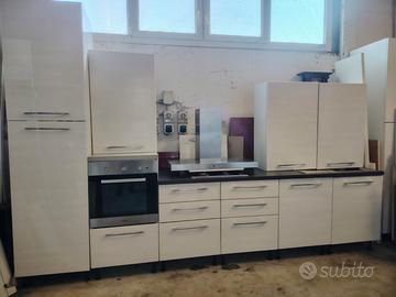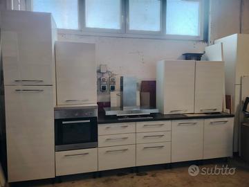 Si vende come da foto cucina moderna laccata bianca di lunghezza 3.60. La cucina comprende cappa aspirante con luci e adorazione, lavello con gocciolatoio, piano cottura a 4 fuochi, mini mobile con forno elettrico incassato, secondo mobile a colonna per dispensa e/o per frigorifero ad incasso, predisposizione per lavastoviglie da 60. NO FRIGO, NO LAVASTOVIGLIE. I moduli forno e mobile frigo sono separabili dal resto della cucina insieme o separatamente e adattabili a preferenza. Possibilità di visione. Possibilità di consegna con supplemento da concordare. Disponibile da subito.