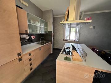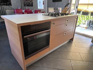VENDO CUCINA CON ISOLA IN LEGNO SOLIDA E CAPIENTE Vendo per ristrutturazione cucina completa molto robusta. Ha una struttura in legno che oggi non fanno più e tanto spazio contenitivo. Lineare 260cm con colonne dispensa, basi e pensili vetro satinato. Isola 188cm con piano cottura gas 4 fuochi + forno Haier funzionanti. Piano bianco, lavello Franke 2 vasche. CAPPA NON INCLUSA. Perfetta per taverna o casa vacanza. Ritiro a carico dell’acquirente.