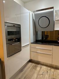 Cucina artigianale come da foto elettrodomestci bauknet e wirpool. Nelle foto non si vede ma il frigo ad incasso è computerizzato per scegliere temperature frigo freezer, in più nelle foto non si vede ma c’è anche la lavastoviglie ad incasso. L’unico problema che riscontra la cucina è il top cucina purtroppo crepato e nell’ ultima anta va fatta mettere la pellicola bianca per il resto è perfetta