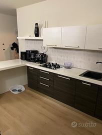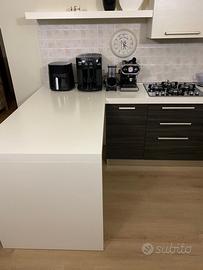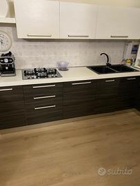 Vendo cucina moderna tinta beije e tortora scuro con venature effetto legno. Completa di lavello a due vasche, fornello a gas in vetro nero, cappa, forno elettrico. Il tavolo che fa da bancone e’ separato: si puo’ cambiare di posizione. Sgabelli non inclusi nel prezzo. Per le misure vedi foto.