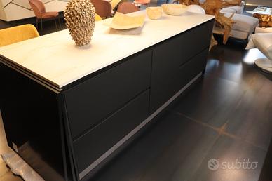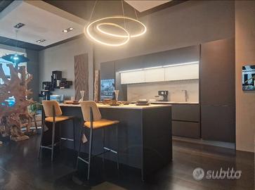 La finutura in nero antracite la rende un'elegante e sofisticata composizione di linee pulite e materiali di alta qualità. Il contrasto tra il nero intenso della finitura e il top chiaro in laminato effetto marmo, conferisce un'atmosfera moderna e raffinata all'ambiente cucina. L'isola, elemento centrale e protagonista dello spazio, si distingue per la sua funzionalità e estetica impeccabile, offrendo un'ampia superficie di lavoro e uno spazio ideale per convivialità e socializzazione. Un vero gioiello di design che trasforma la cucina in un luogo di stile e glamour.