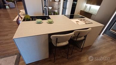Cucina di showroom colonne in finitura pet sabbia, e finitura pet metal, isola in hpl piasentina e ante isola melaminico piasentina, zoccolo e gola in finitura piombo. Elettrodomestici Hot point ( forno, micro, lavastoviglie, piano cottura e frigo ) lavello e miscelatore elleci