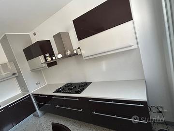 Cucina in laccato lucido 7 strati colore moka, no laminato. Piano e parete in okite, ante superiori in vetro con luci sotto pensile. Colonna elettrodomestici a terra, parte restante sospesa. Compreso piano cottura a gas.