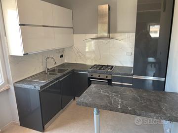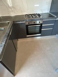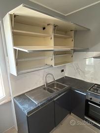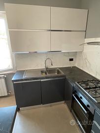Vendo cucina su misura usata poco in ottime condizioni di Gennaio 2020 pagata 7000€ modello Veronica Mondo Convenienza, pensili superiori bianco lucido 4 sportelli vasistas misure 180x95 cm, pensili inferiori grigio lucido, 3 sportelli, 3 cassetti, frigo incassato, lavello, piano cottura, forno, lavastoviglie, cappa. La misura della cucina sul lato frigo è di 263 cm e sul lato lavello è di 122 cm, la penisola misura 120x60 cm altezza top 6cm. Tutte le maniglie sono a gola ed i cassetti ammortizzati. Vendo per ristrutturazione.