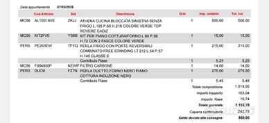 Vendo cucina modello Athena, usata solo 1 anno, in condizioni ottime, vendo per cambio casa. ✔️ Piano cottura a induzione ✔️ Forno elettrico ✔️ Frigorifero combinato ✔️ Cappa aspirante ✔️ Lavello + miscelatore ✔️ Pensili e basi capienti Colore verde opaco con top effetto rovere, design moderno. 📏 Lunghezza circa 195 cm 💰 Prezzo: 750€ trattabili (pagata oltre 1.100€) 📦 Smontaggio e trasporto a carico dell’acquirente ❗ Disponibile subito – precedenza a chi viene a vederla per primo