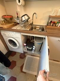 Cucina Mondo Convenienza modello STELLA – ottime condizioni (2024) Vendo cucina componibile Mondo Convenienza, modello Stella, acquistata a ottobre 2024 e in ottimo stato. Vendo per trasloco. Caratteristiche principali: Colore struttura: bianco Ante: avorio opaco Maniglie: nichel satinato (orizzontali) Top: effetto noce Alzatina: alluminio Zoccolo: alluminio Piedini: h 15 cm Illuminazione LED touch sottopensile Composizione inclusa: Base 60 cm con 2 cassetti + 1 cestone Base sottolavello 60 cm Base forno/piano cottura 60 cm Anta lavastoviglie (solo frontale, elettrodomestico NON incluso) 3 pensili da 60 cm Cappa aspirante inox 60 cm Lavello inox 1 vasca con gocciolatoio Piano cottura a induzione Forno elettrico ventilato Top laminato (circa 3 metri lineari) Fianco penisola/sostegno Dimensioni indicative della composizione: Sviluppo principale circa 300–304 cm lineari Profondità standard: 60 cm Altezza basi: 72 cm (+ piedini e top) Dettagli: Cassetti e ante non ammortizzati Presenti normali segni di utilizzo su piano cottura e lavello Nessun difetto strutturale NON inclusi: Lavastoviglie e Lavatrice Prezzo: 1400 € trattabili Ritiro: Milano (zona Porta Venezia) Cucina attualmente montata – smontaggio da concordare Disponibile entro metà maggio (tempistiche da concordare). Foto e progetto completo disponibili su richiesta. Cucina recente e completa, ideale per chi cerca una soluzione pronta all’uso a prezzo contenuto.