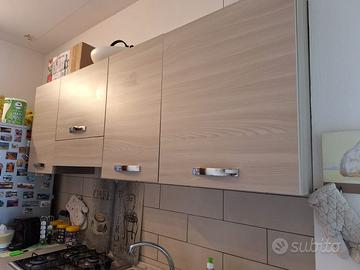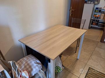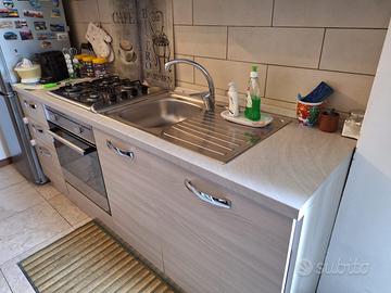 Cucina con lavastoviglie, fuochi a gas e forno. Tavolo con due sedie. Disponibile da agosto.