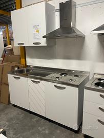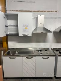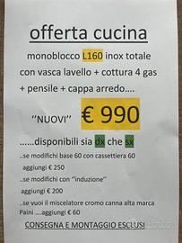 Cucine monoblocco con top totale in acciaio inox, complete di lavello e piano cottura 4 fuochi a gas, scolapiatti e cappa arredo.. misura L160 x 60 x h210, disponibili nuove sia in versione destra che sinistra,