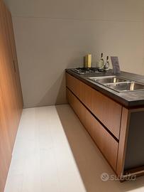 Per cambio arredamento espozione, vendo cucina come da foto, con bancone ,basi con cassettoni su entrambi i lati misure 250x98 , completo di lavello e piano cottura a gas, parte colonne misure 370x76 altezza 210 due con anta a battente e le due centrali con ante scorrevoli,formula vista e piacuta