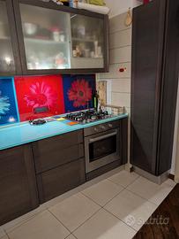 Cucina gatto in legno rovere scuro. Lineare 2,5 m piu mobile alto come da foto. Top in vetro. Piano cottura, forno e lavastoviglie funzionanti. Smontaggio e ritiro a carico dell’acquirente. La parete con i fiori che si vede in foto è un pannello di vetro serigrafato rimovibile.