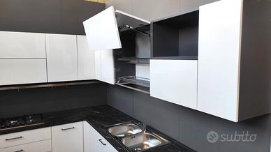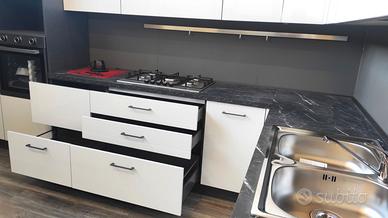 Cucina di fine serie componibile in base alle vostre misure, sposto i vari elementi anche in base alla distanza degli scarichi del lavello. Elettrodomestici inclusi: frigo con freezer a 3 cassetti sotto, forno ventilato multifunzione, piano cottura 5 fuochi inox, cappa ad incasso, lavello inox. Predisposizione per lavastoviglie ad incasso. Tutte ante rallentate, zoccolo ed alzatina inclusi! Possibilità di trasporto e montaggio con prezzo da definire