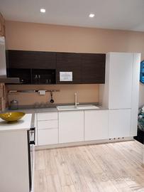 Cucina nuova da esposizione cm 244x309 , laccata bianco opaco/pensili melaminico olmo dark, piano in quarzo, completa di elettrodomestici GRUNDING, lavello PLADOS in fragranite Bianco
