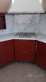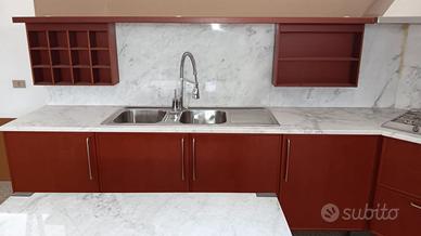 Cucina nuova da esposizione, con ante in ciliegio e top e schienale in VERO MARMO, in abbinato anche il tavolo. Cucina completa di lavello, rubinetto, cappa ad angolo, piano cottura, forno e frigorifero. Comprese le mensole e i piccoli vani a giorno. Non ci sono i pensili, ma abbiamo la possibilità di sceglierli a listino nuovi.