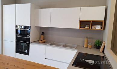 Per rinnovo nostra esposizione vendiamo sotto prezzo di acquisto questa NUOVA cucina di alta qualità come vista e piaciuta (elettrodomestici NON compresi), con ante laccate bianco opaco, piani top in laminato finitura cemento grigio chiaro, piano penisola e pensile a giorno in legno di rovere nodato. Apertura con sistema a gole laccate bianco opaco, chiusure a rientro ammortizzato, zoccoli ribassati in alluminio finitura bianco opaco da cm 8h.