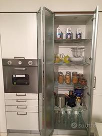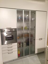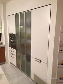 Cucina con struttura in multistrati marino no truciolare composta da: basi finitura impiallacciata ciliegio, pensili e colonne laminato bianco opaco. E' composta da: BASI (base lavello cm.120 con due cestoni e pattumiera per la raccolta differenziata, base cm.90 con piano cottura e due cestoni, base cm.120 con due cestoni), PIANO DI LAVORO (piano di lavoro H.6 in laminato bianco con bordo alluminio completo di lavello 87x51 Foster filotop due vasche inox, miscelatore Newform cromato, piano cottura Foster Magic filotop 4 gas valvolato inox con griglie ghisa); PENSILI (pensile cm.120 H.72 scolapiatti due ante apertura vasistas sotto vetrina con luce interna, pensile cm.90 H.36 con anta vasistas predisposto per cappa, pensile cm.120 H.72 con due ante vasistas sotto vetrina con luce interna, due sottopensile cm.60 in ciliegio, tubo cromato cm.120 con ganci, tubo cromato cm.120 con ganci, portascottex cromato); COLONNE (colonna cm.60 H.216 vano per forno e tre cassetti+cestone, colonna dispensa cm.90 H.216 vetrina a soffietto, colonna cm.60 H.216 predisposta per inserimento frigorifero).