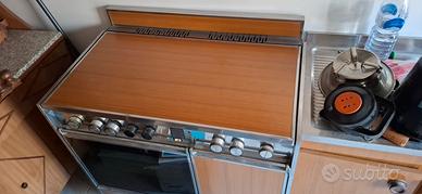 Cucina a gas della prestigiosa azienda Olmar, 4 fuochi a gas e due piastre elettriche. Ampio forno a gas. Scomparto porta bombola e ripiano di copertura fuochi in tinta noce nazionale.