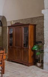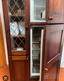 Cucina della nonna anni 20 prodotta da Patriarca ....composta da mobile piano cottura gas/forno elettrico e con cappa aspirante....mobile lavello in acciaio inox a 2 vasche e con scolapiatti....mobile frigorifero incassato e vetrinetta.....mobile dispensa a tre ante a vetrina e cassettiera......tavolo rettangolare e 6 sedie impagliate.....il tutto in legno massello di pino vernice mogano e ripiani in marmo cm 3 antimacchia ....usata pochi anni e conservata in magazzino trovasi in buono stato..