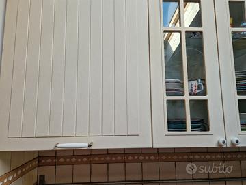 4 pensili 60x70 profondità 37cm con 2 ripiani interni. I pensili inglesina hanno 2 ripiani in vetro. La cassettiera 81x79 profondità 58cm. Cassetti con sistema scorrevole. Il top è in lamellare massello, spessore 3 cm, può essere tranquillamente levigato. Vendo per necessità di ampliamento. prezzo trattabile, ritiro in zona