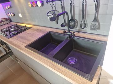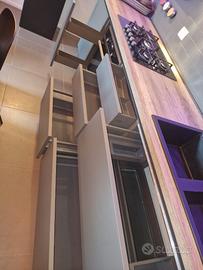 Con cassettoni e pensili con apertura a ventaglio . La cucina è lunga 3 metri per chi ha spazio c'è la possibilità di trasformarla a angolo
