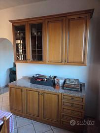Vendesi cucina attrezzata, in legno di alta qualità e piani di lavoro in granito, con piano cottura a quattro fuochi, forno e frigorifero a incasso e lavabo a due vasche. Cucina datata ma in ottimo stato di conservazione. Vendesi per mancato utilizzo. Forno come nuovo, visto che veniva utilizzato poco per la presenza di un altro nella zona cucinino.
