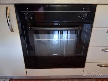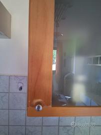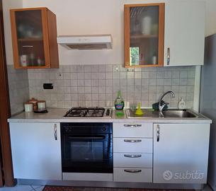 Vendo, causa trasloco, cucina super funzionale color noce, avorio e top bianco/grigio effetto marmo, due pensili in vetro come potete vedere dalle foto, usata con segni di usura sempre evidenziati in foto ma tutto che funziona alla perfezione, sia il forno che la cappa ed il piano cottura, MAI avuto problemi.
