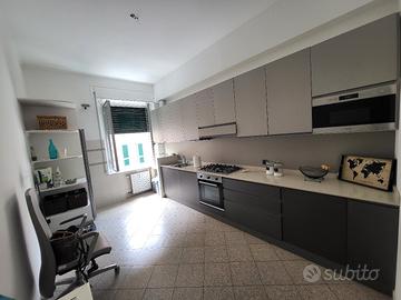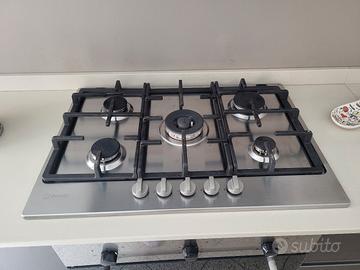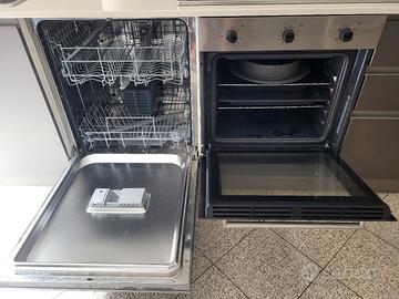frigo con congelatore hotpoint (altezza: 190 cm, larghezza 60 cm), lavastoviglie, forno microonde, lavatrice, forno elettrico, piano cottura in acciaio con accensione automatica (e cappa aspirante) e lavello in acciaio inox. Piano di appoggio in marmo