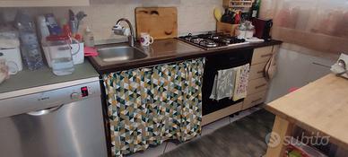 Vendo cucina lineare come in foto lunghezza 195 cmx60 cm profondità parte bassa con lavello e gocciolatoio in acciaio, sotto lavello dotato di tendina con due ripiani, piano cottura funzionante e forno elettrico ( funzionante solo grill), quattro cassetti, e 255 cm di larghezza parte superiore composta da un pensile a sportello di 60cm larghezza per60 di profondità, scolapiatti 90 cm larghezza x33 profondità, sportello e cappa 60cm x33cm, sportello con vetro opaco 60cm x 33cm.